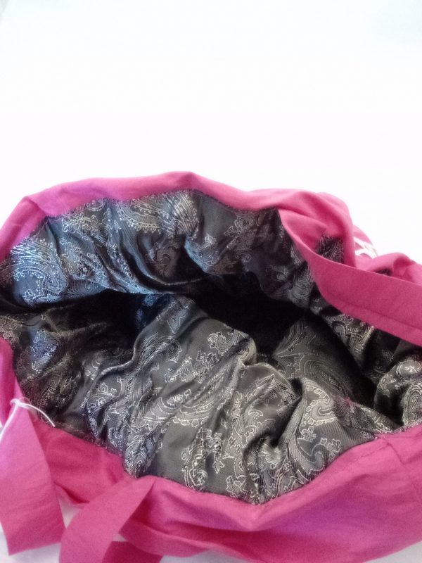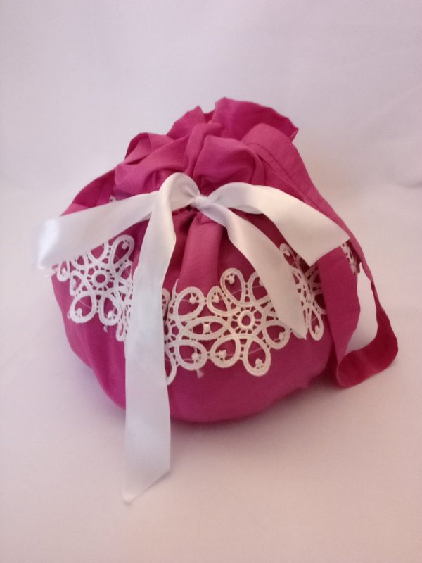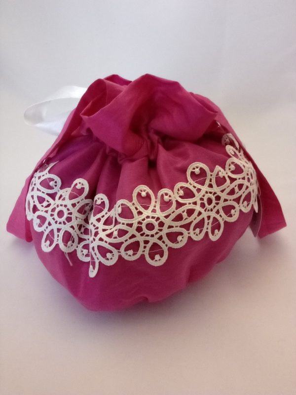 A beautiful drawstring bag made from high quality cerise pink taffeta with white guipure trim and white satin ribbon, lined with silver grey paisley fabric.
