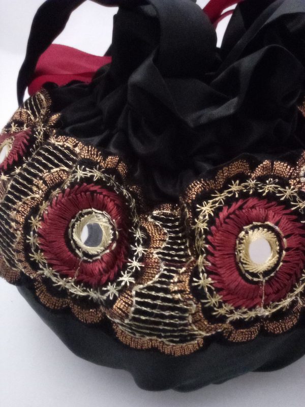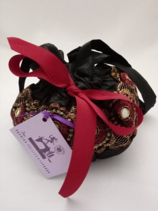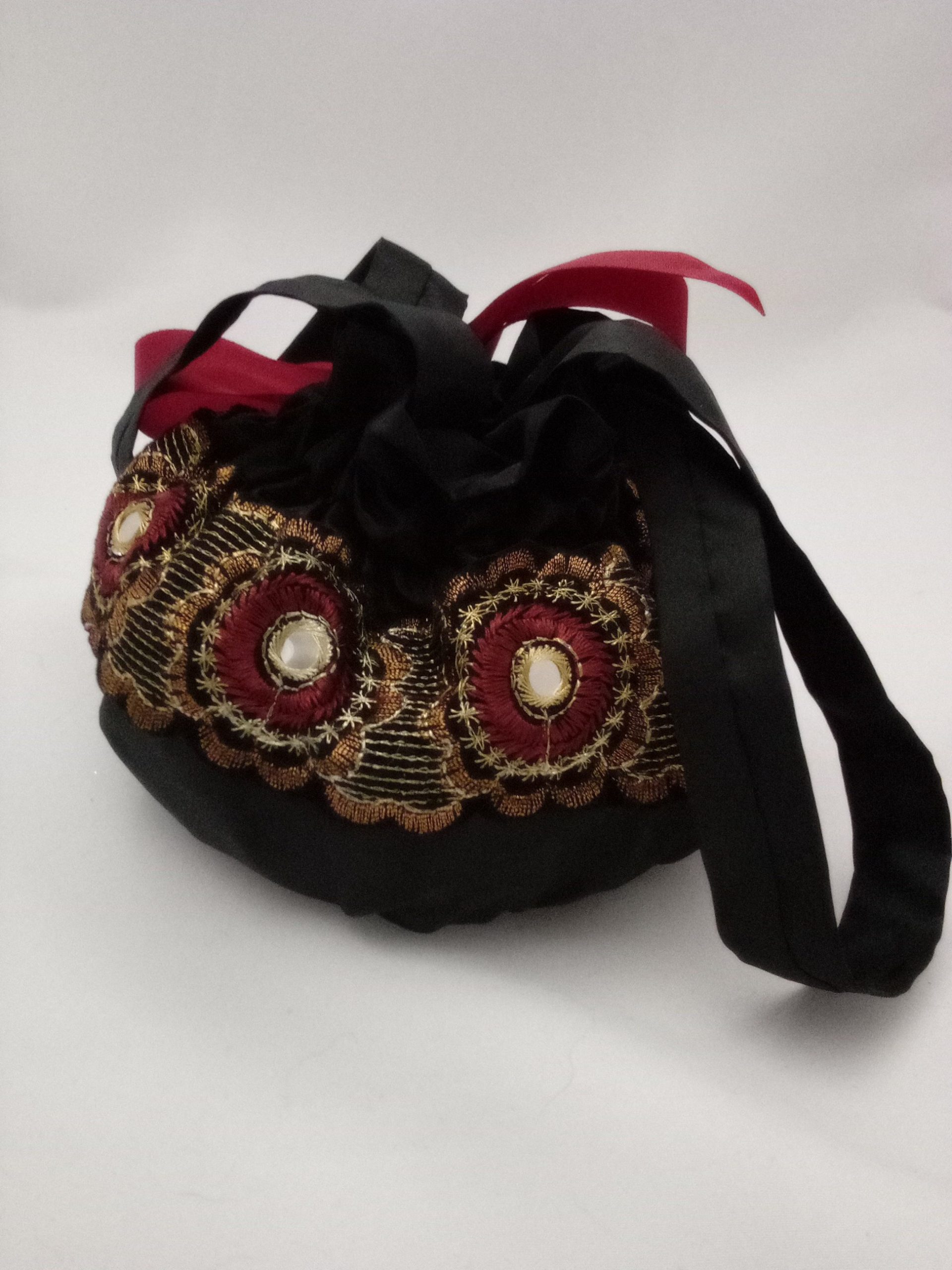 A beautiful drawstring bag made from high quality black taffeta, unusual Aztec style trim and closed with a dark red ribbon. It is lined with a gorgeous black paisley fabric.